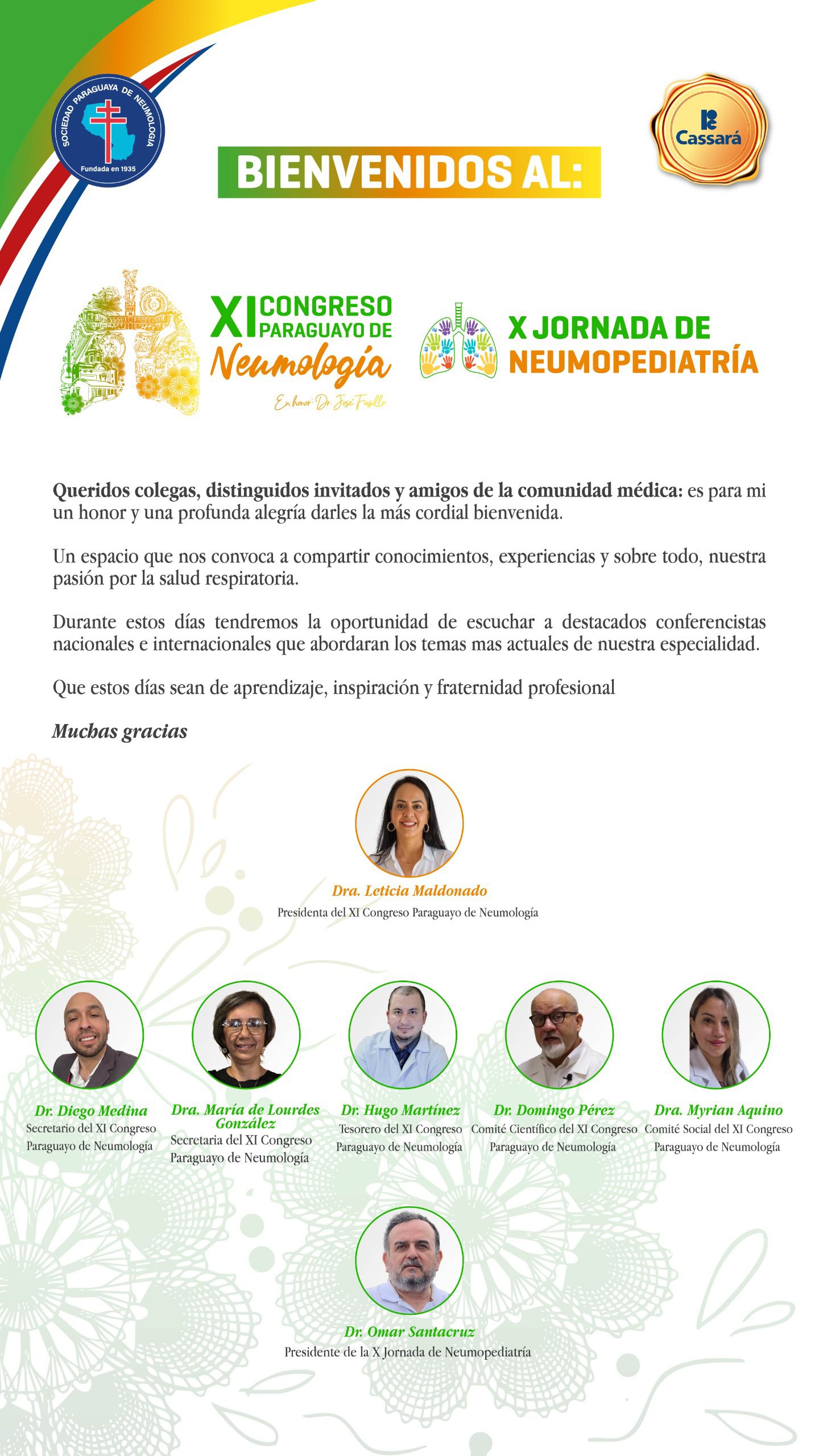 Es un honor darles la más cordial bienvenida al XI Congreso Paraguayo de Neumología, que se llevará a cabo los días 13, 14 y 15 de noviembre de 2025 en el prestigioso Centro de Eventos Paseo La Galería, en Asunción, Paraguay. En el marco de este encuentro académico y científico, también se desarrollará la X Jornada de Neumopediatría, espacio especialmente dedicado a la actualización en el abordaje de las enfermedades respiratorias en la infancia y adolescencia.